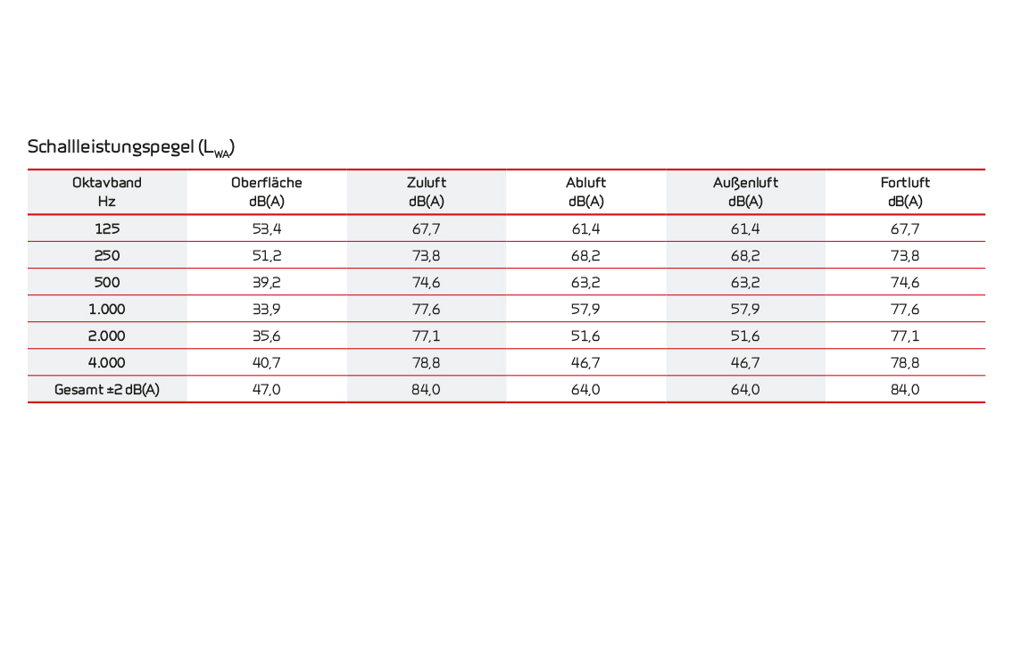 SchalldatenSchalldaten gelten für qV = 4800 m3/h und Pt, ext = 250 Pa nach EN 9614-2 für Oberflächen und EN 5136 für Kanäle. Der Schallleistungspegel LWA sinkt bei abnehmender Luftmenge, bzw. abnehmendem Gegendruck. Der Schalldruckpegel LpA in einem gegebenen Abstand hängt von den akustischen Bedingungen am Installationsort ab. |