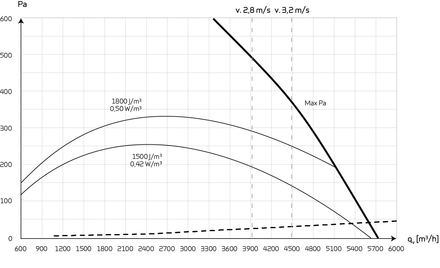 Leistung (Kondensationstauscher)Die folgenden Daten werden auf Basis eines Kondensationstauschers berechnet. Leistung eines Standardgerätes als Funktion von qv og Pt, ext. Elektroeffizienz nach EN 13053 gilt für Standardgeräte mit ISO ePM10 >60% (M5) und ISO ePM1 50% (F7) Filtern und ohne Heizregister. * Die Luftgeschwindigkeit über der Verdampferoberfläche wird bei Meter pro Sekunde gemessen. Achtung! SFP-Werte werden gemessen und als Gesamtwert für beide Ventilatoren angegeben. |